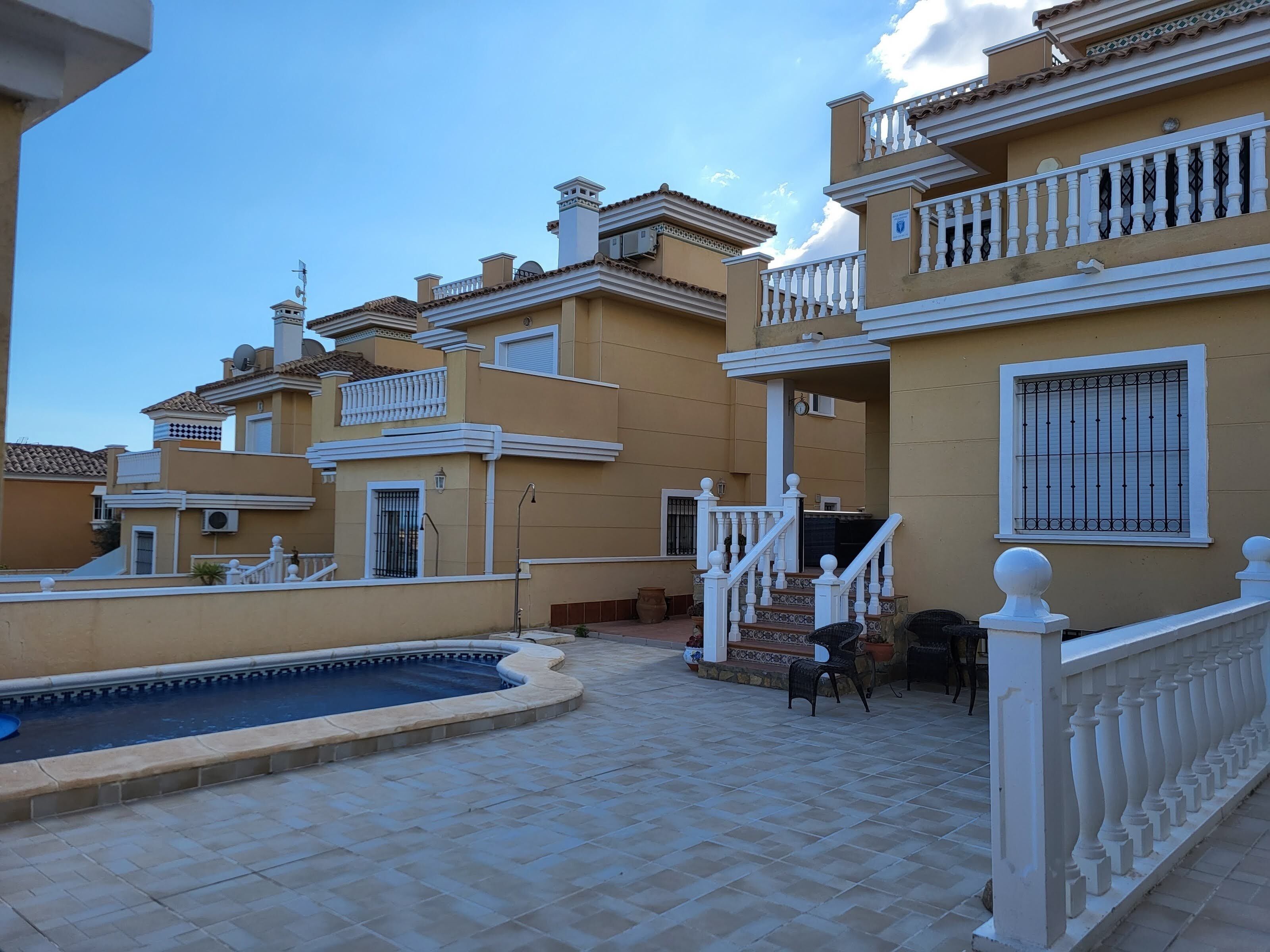 A specious 3 Bed villa with 2 Bathrooms, balconies, fully equipped fitted kitchen/utility room and a privet swimming pool in Orihuela-Costa. The property is equipped to sleep 6-8 adults and its close to blue flag beaches (10 min drive) La zenia Shopping mall and surrounded by 3 golf courses. Restaurants, pubs and supermarkets are within walking distance. A car is necessary if you wish to explore surrounding regions. There are plenty of activities for both adults and children nearby (free Parking is available). There is a downstairs bedroom and bathroom with a walk-in shower cubicle suitable for accompanying elderly. although there are five steps to enter the property. The upstairs bathroom has a Jacuzzi bathtub and an overhead shower. the property has both AC and fans fitted throughout. there is plenty of outdoor space for activities.