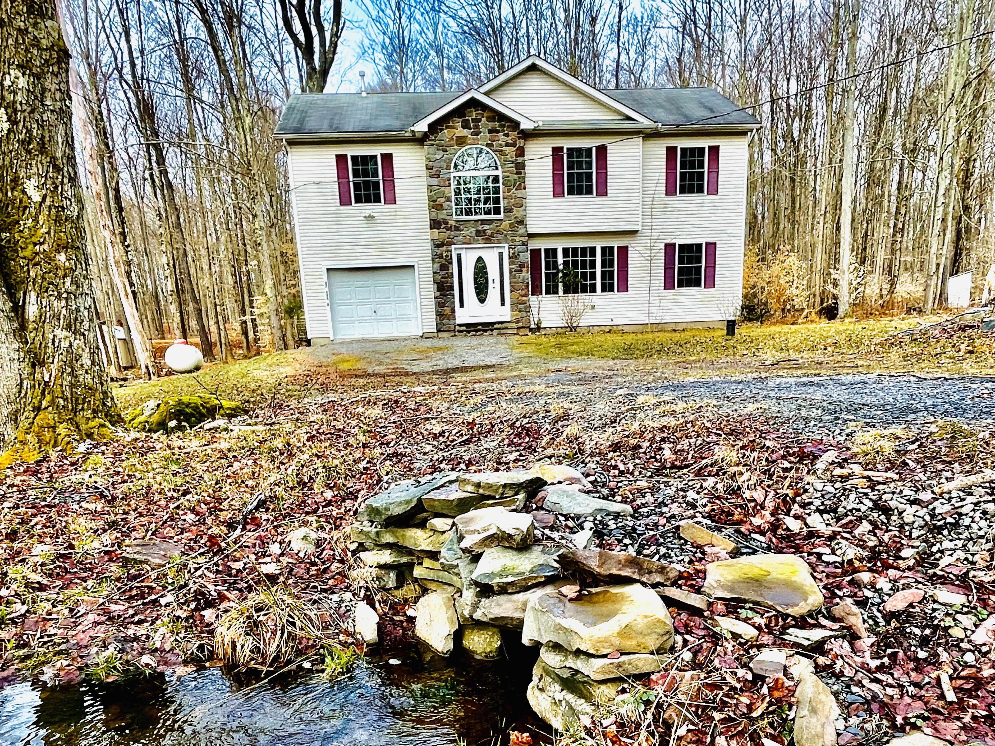 This newly renovated beautiful Pocono home with porch is perfect for all seasons & occasions in Arrowhead Lake amenity filled gated community. It is situated on a gorgeous wooded lot right on the edge of the state game lands! With a nearby heated pool in a secure gated community. Washer, dryer, dish washer, TV, and more! central air.
