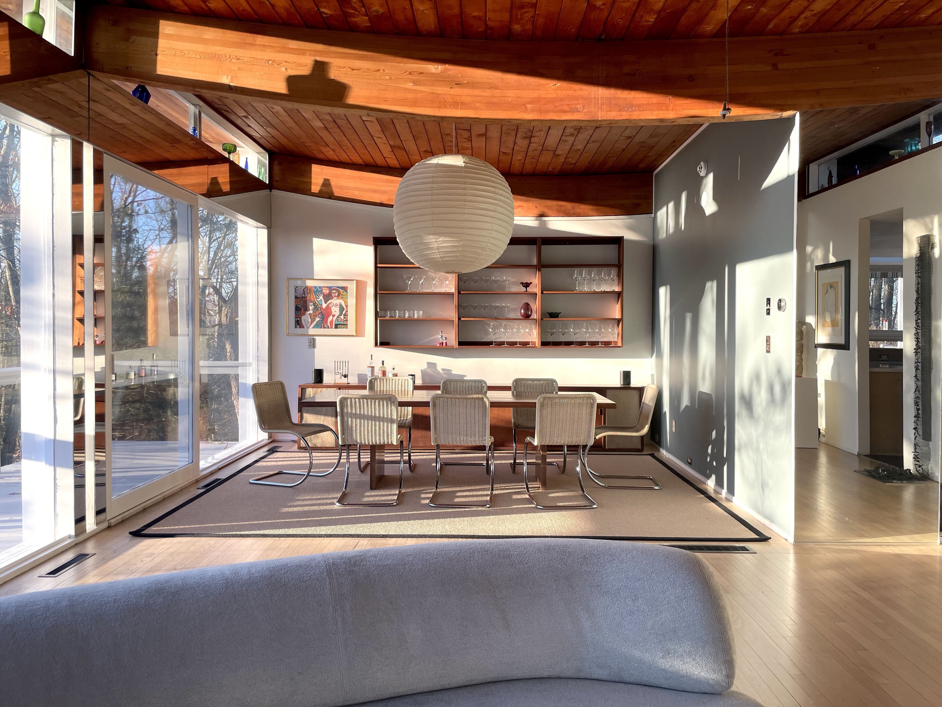 This classic midcentury modern house of ‘68 is a dream for any design enthusiast. The house seemingly floats above its site and so does the stunning butterfly roof. The views are equally beautiful without any other structures in site, just trees and the distant mountain range. An all glass floor to ceiling south facing facade with large sliding doors connects you visually and physically to the outside. Rumor has it that this house was a meeting point for some of the Woodstock rockstars in 1969.