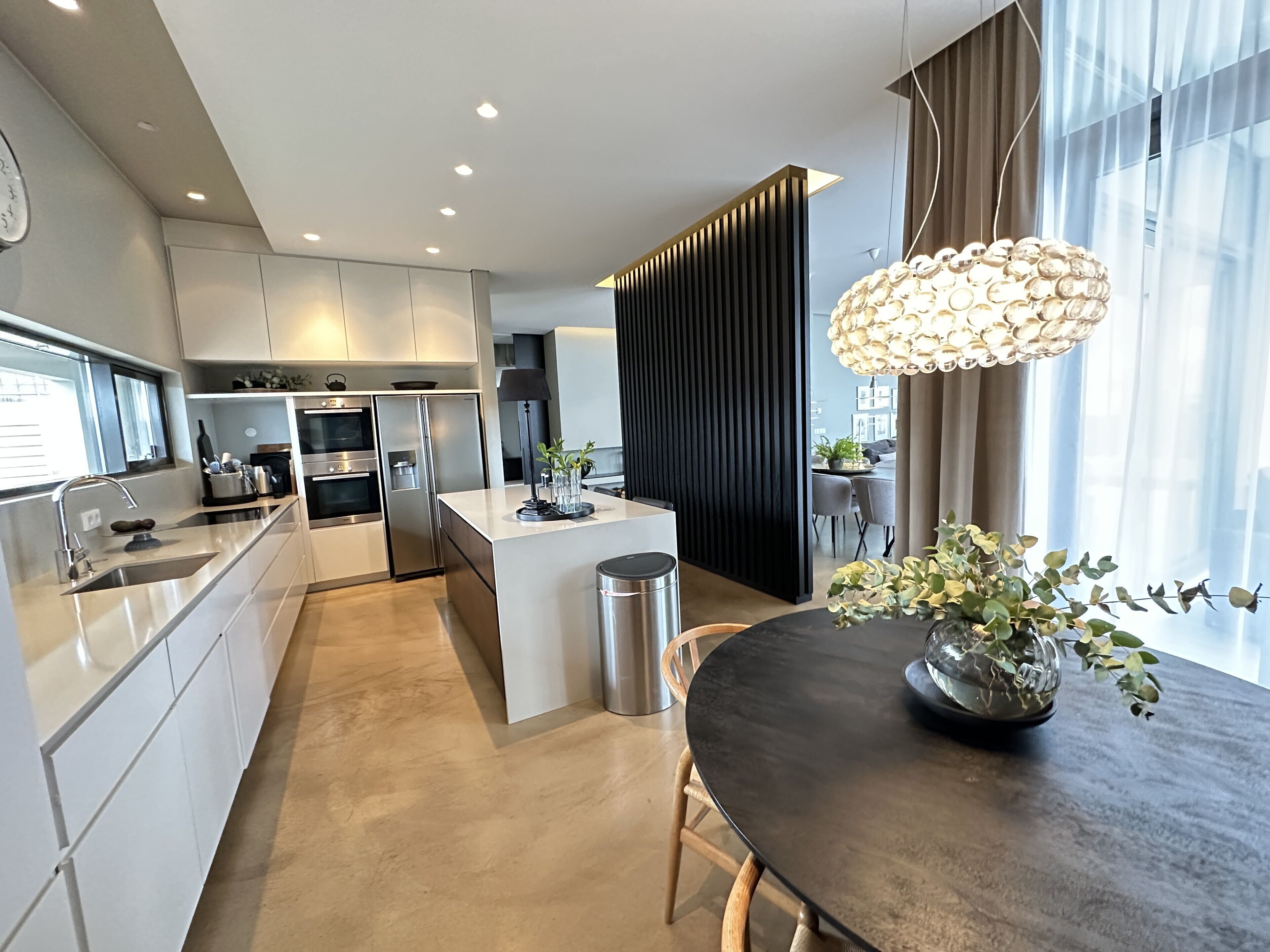 A washing machine can be accessed on the lower floor together with bikes, storage area and garage. The house has 2 parking places of own property next to the villa.