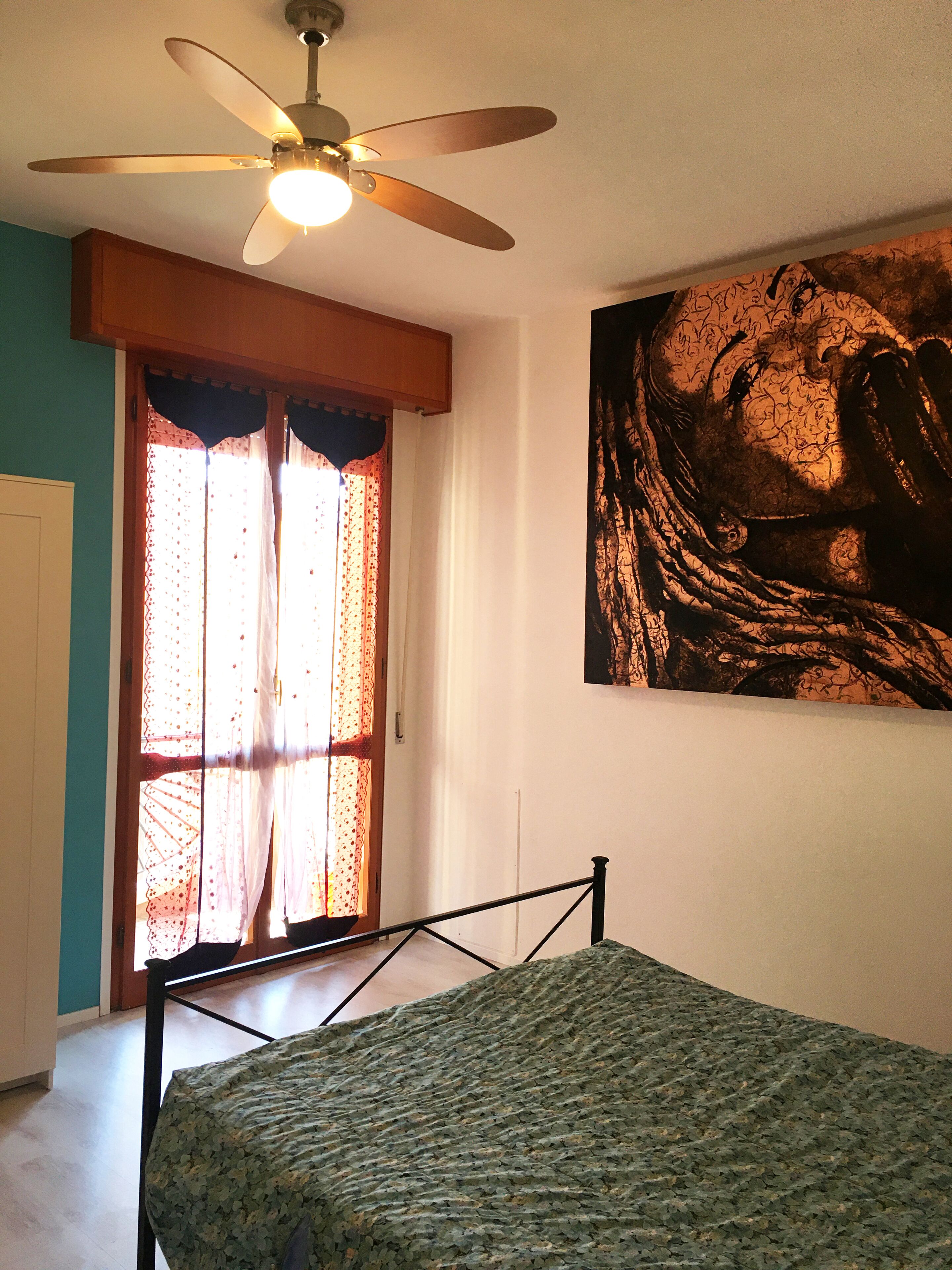 The apartment is located inside our art studio. It is furnished in a simple way, but also embellished by some of our works. The first bedroom is large, equipped with a double bed and a sofa bed. The second is equipped with a double bed. There are two balconies: one overlooks a quiet street, the other overlooks the garden. The kitchen is equipped with a microwave oven, a two-plate electric stove, a refrigerator, an electric kettle and a coffee machine. The accommodation has just been renovated. The entrance to the apartment is shared with our atelier. The house is a beautiful 70's villa, 10 minutes walk from the beach.