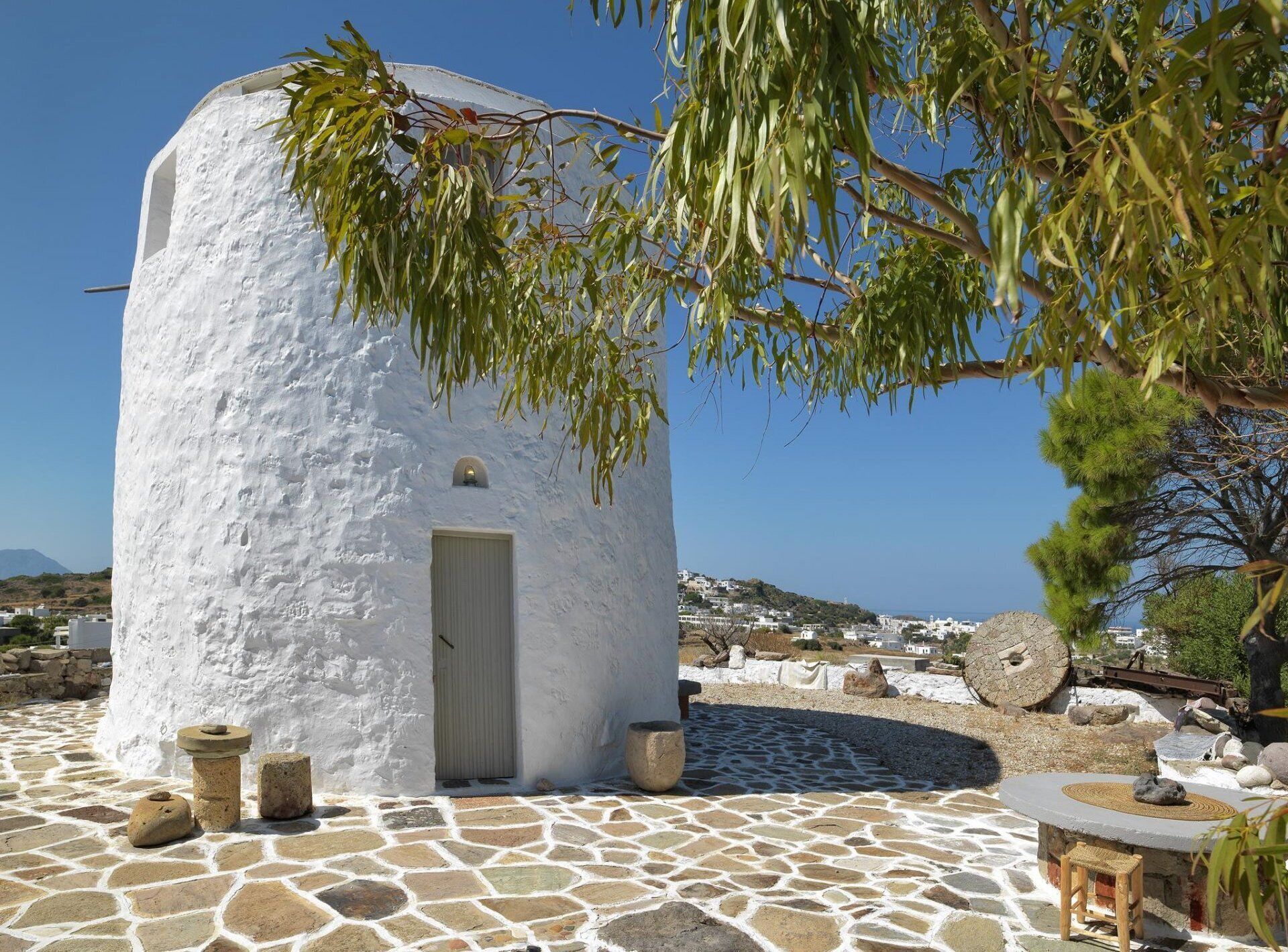 The 3-story windmill can accommodate up to 4 guests. It consists of two very comfortable bedrooms, a bathroom with shower, lounge and ample outdoor space. The highlight of the property is the large external living room with its extensive views of the sea, the coastal landscape and the tranquil atmosphere of the village of Trypiti.Right next to the windmill, there is also a studio for two people, consisting of a comfortable bedroom with a double bed and a bathroom with a shower. (Not included)