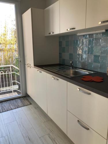 An equipped kitchen, the appliances are new: induction hob, fridge/freezer, oven. The kitchen opens onto the balcony.