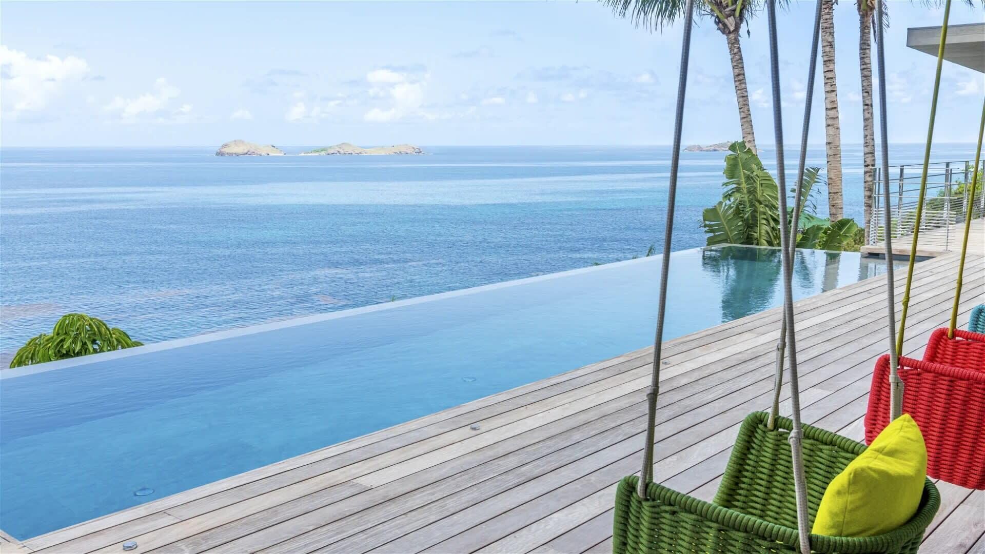 Upon entering Villa Bom, you’re immediately seduced by the breathtaking sea view, and the warm, comfortable-yet-slightly-exotic feeling of the interior design. Although this luxury villa is the work of architect François Pécard, who has spent the past 30 years designing many of the most prestigious homes on St. Barth, there’s something about it that may briefly transport you to Bali. The property has graceful rooflines and open pavilions that bring to mind breezy South Seas bales, exotic wenge wood floors and a stunning black lava-tiled pool that rises up from an expansive wood deck and overflows on all four sides. But as you settle in under the whitewashed wood ceilings, it becomes undeniable that you’re in the Caribbean—in fact, in one of the finest vacation homes in the West Indies.