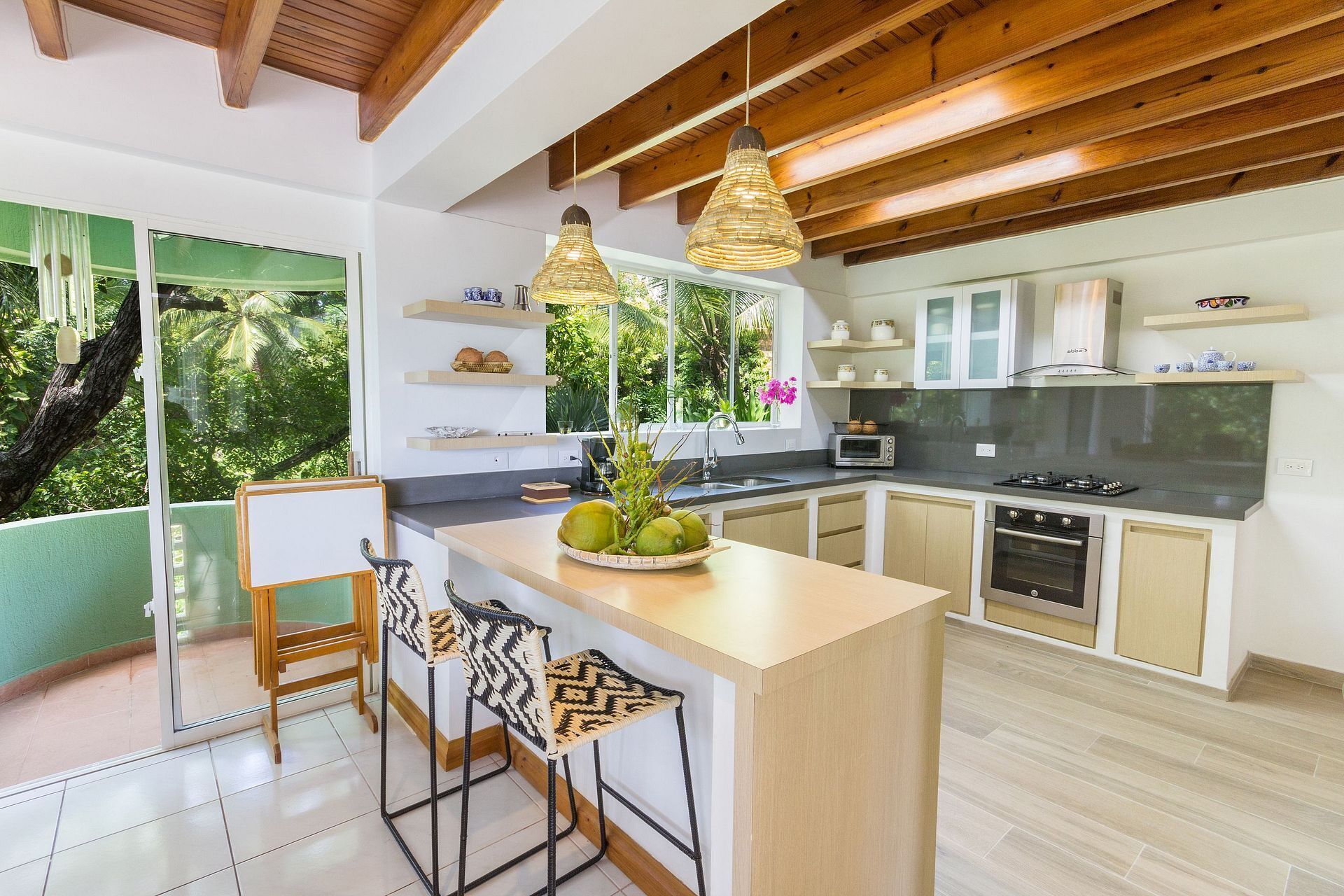 The dining room is next to the kitchen and has a wine cellar next to a 6-seater dining table. The American-style kitchen is decorated with local craft items and well equipped with modern appliances, as well as a beautiful view of the trees and surroundings.