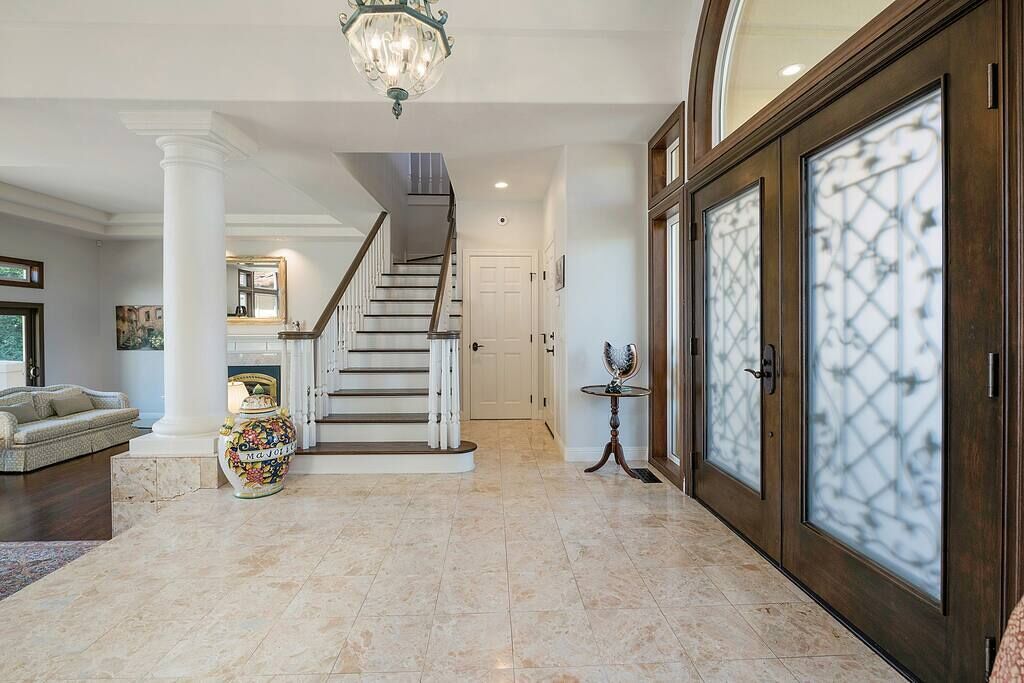 This home is an architectural masterpiece, complete with carved marble columns and Italian fireplaces. The grand entrance features stone floors and a sweeping staircase, highlighted by a huge metal and crystal chandelier. Main floor includes a large separate dining room, gourmet kitchen with huge granite island, two dishwashers, Viking Professional appliances, a library with Italian carved marble fireplace, powder room, great room, complete with a gorgeous bar, cathedral ceilings and carved marble fireplace. In addition, there is an oversized bedroom and bath on the main level. Each room has sliding glass doors leading to outdoor patios or balconies.