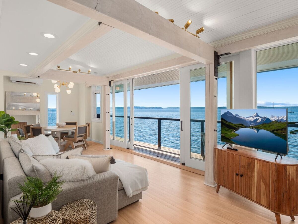 The beach house boasts a bright and airy interior with French inspired decor, designed to make you feel at ease from the moment you step inside. The open-concept living area features large windows that frame stunning vistas of the Puget Sound, filling the space with natural light and the soothing sounds of gentle waves.