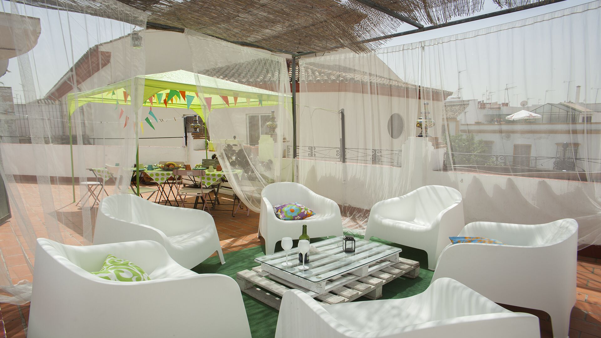 In the attic and top floor, a beautiful living room with a sofa, tv, etc divides the two private terraces of the House. Both have garden furniture and are perfect to enjoy the pleasant climate of Seville and its sunlight all year round. In addition, on this top floor there is also a courtesy bathroom to enjoy the terrace area.