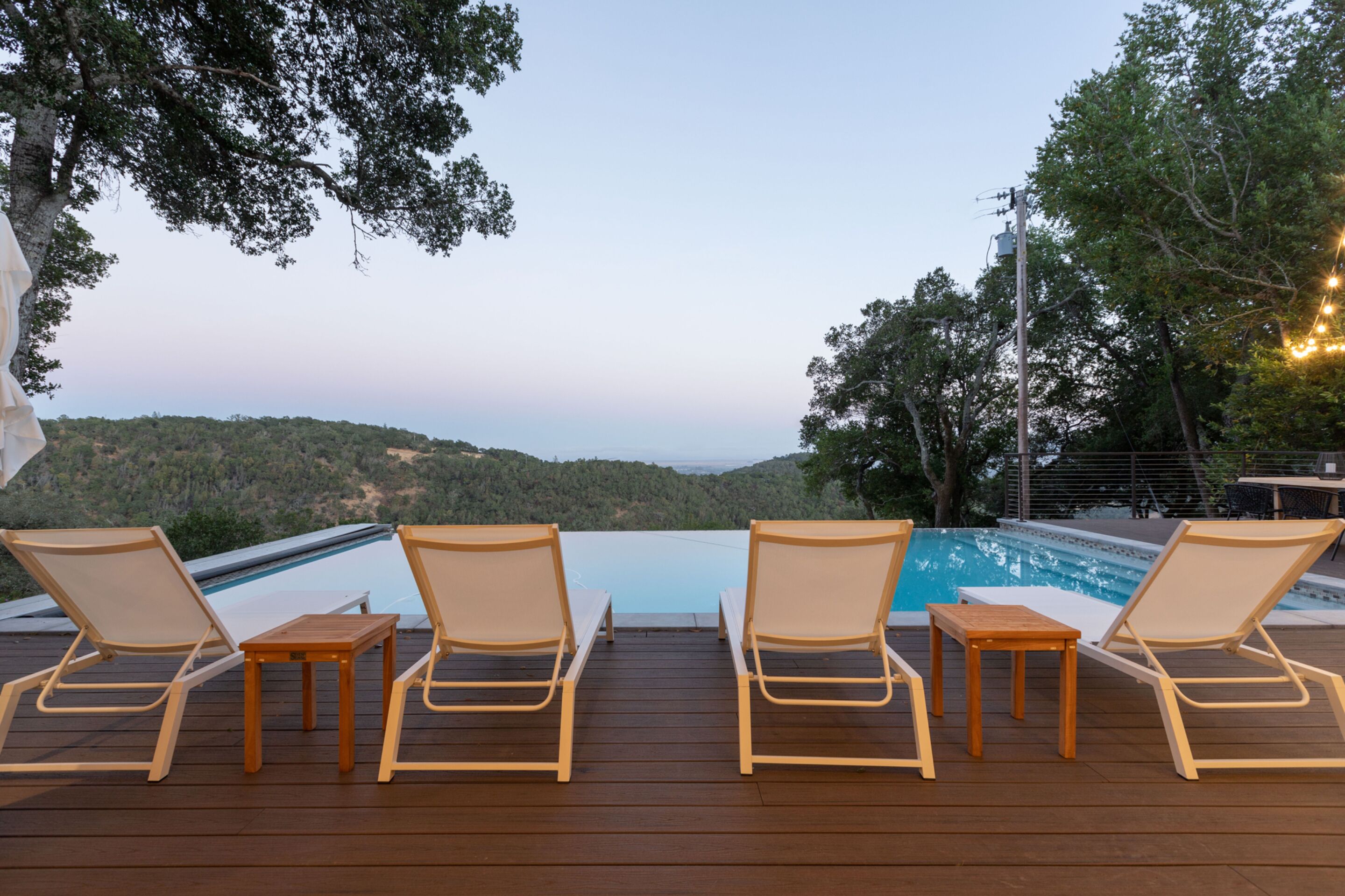 The 3,052 square-foot villa reflects its beauty with three gently flowing fountains and five outdoor seating areas -- a heated courtyard with fountain shaded by a beautiful Japanese maple tree, a large redwood deck shaded by trellised grape vines, a 1385-square-foot upper terrace with several seating areas and fire pit and a dining table for eight persons overlooking the 50-foot infinity swimming pool and spa with a view of Mount Tamalpais in the distance, down a path through an olive grove to a circular stone seating area above a winter seasonal creek studded with majestic ferns and oak trees, and beyond a conifer garden a pagoda that affords stunning views of the Sonoma Valley and Mount Tamalpais, some 40 miles away near the San Francisco Bay and, if you care to stroll farther, a quiet reflective meditation garden.