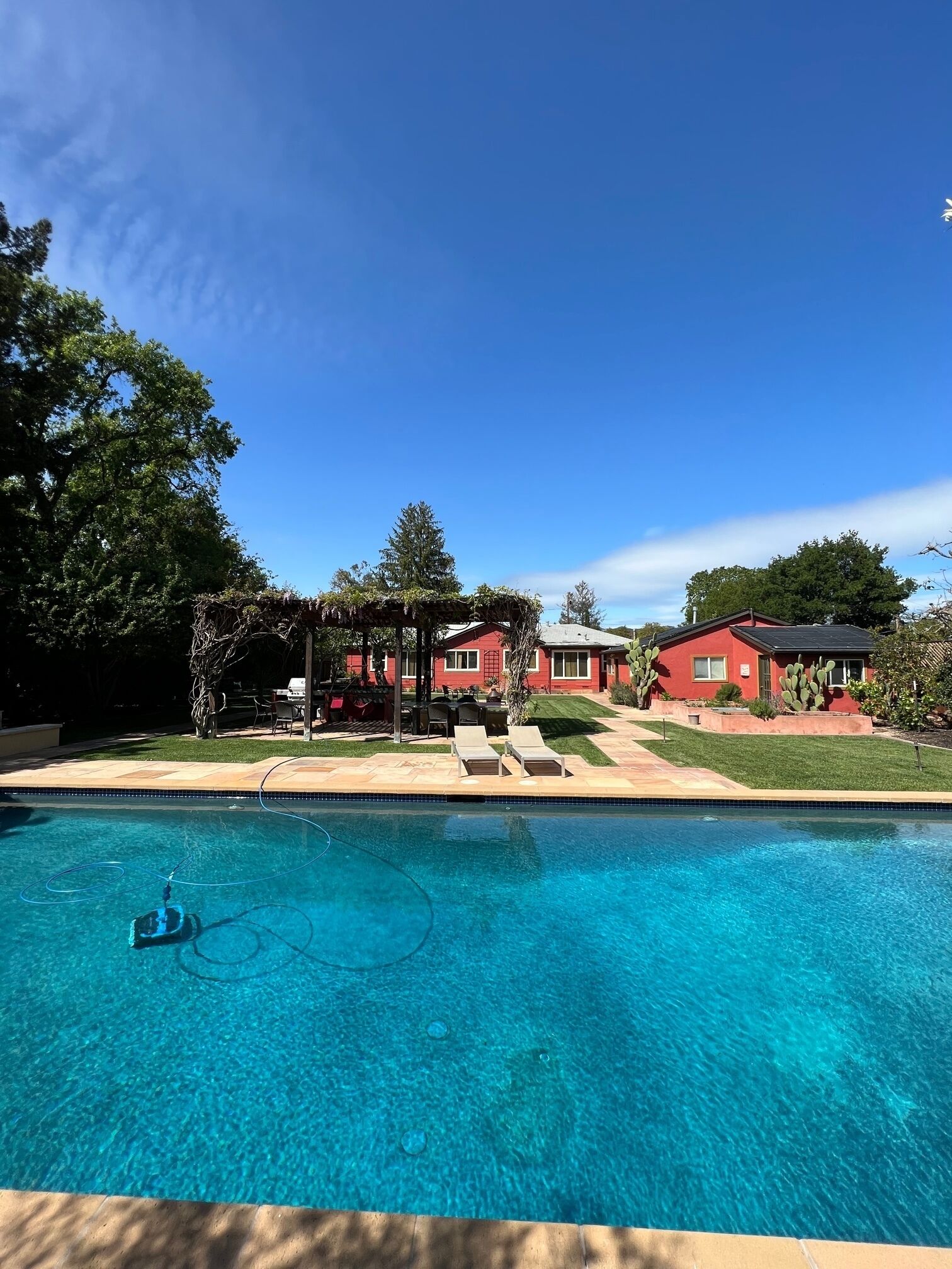 Our home includes a main house, art/music studio and guest cottage which surround a center courtyard with a large deck, concrete dining table, lawn, pool, bocce court and olive orchard. The main house has 3 bedrooms and 2 full recently remodeled bathrooms. Master bedroom has a Cal King bed and private bathroom with dual sinks. Second bedroom has a Queen bed. Third bedroom has twin beds. There is an office adjacent the twin bedroom. Our home is reminiscent of a tuscan villa, with rustic wood floors, and a large country farm table. The kitchen has concrete countertops, new stainless steel appliances, a country farm sink, and is fully stocked with all modern amenities. There is a breakfast nook and two person bar adjacent the kitchen, perfect for guests to mingle while preparing dinner. The kitchen opens up to the great room with living area, dining room, and gas fireplace.