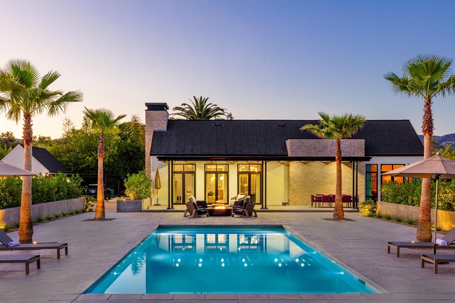 Welcome to Marquee. A good time at this sleek and modern home isn’t a probability…it’s a promise. How could it not be at a home professionally designed for you and your closest friends? We’re talking about a family room with a record player and ample provided games. Outside, you’ll find covered dining and lounge spaces, a super sleek fire pit, a pool, hot tub, and some red hot decor. Best part of it all? There are many, many surfaces to drink local wine on. Hang out responsibly!