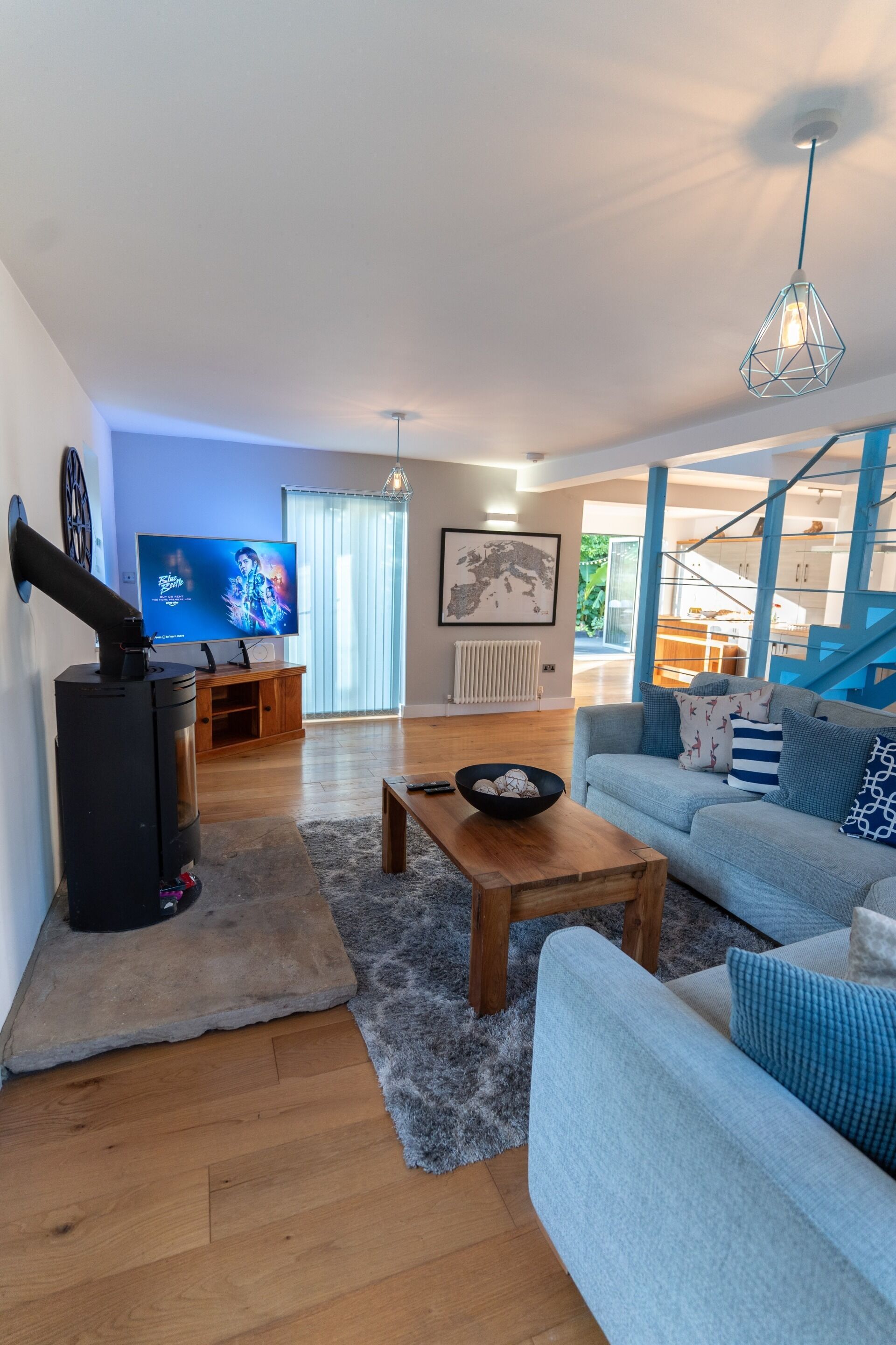 The ground floor features an open-plan layout, complete with a stylish L-shaped sofa and a cozy log burner, accompanied by a generous smart TV. All rooms feature bi-folding doors that open to the mature garden, showcasing a 600-year-old oak tree and a tranquil stream in the backyard.
