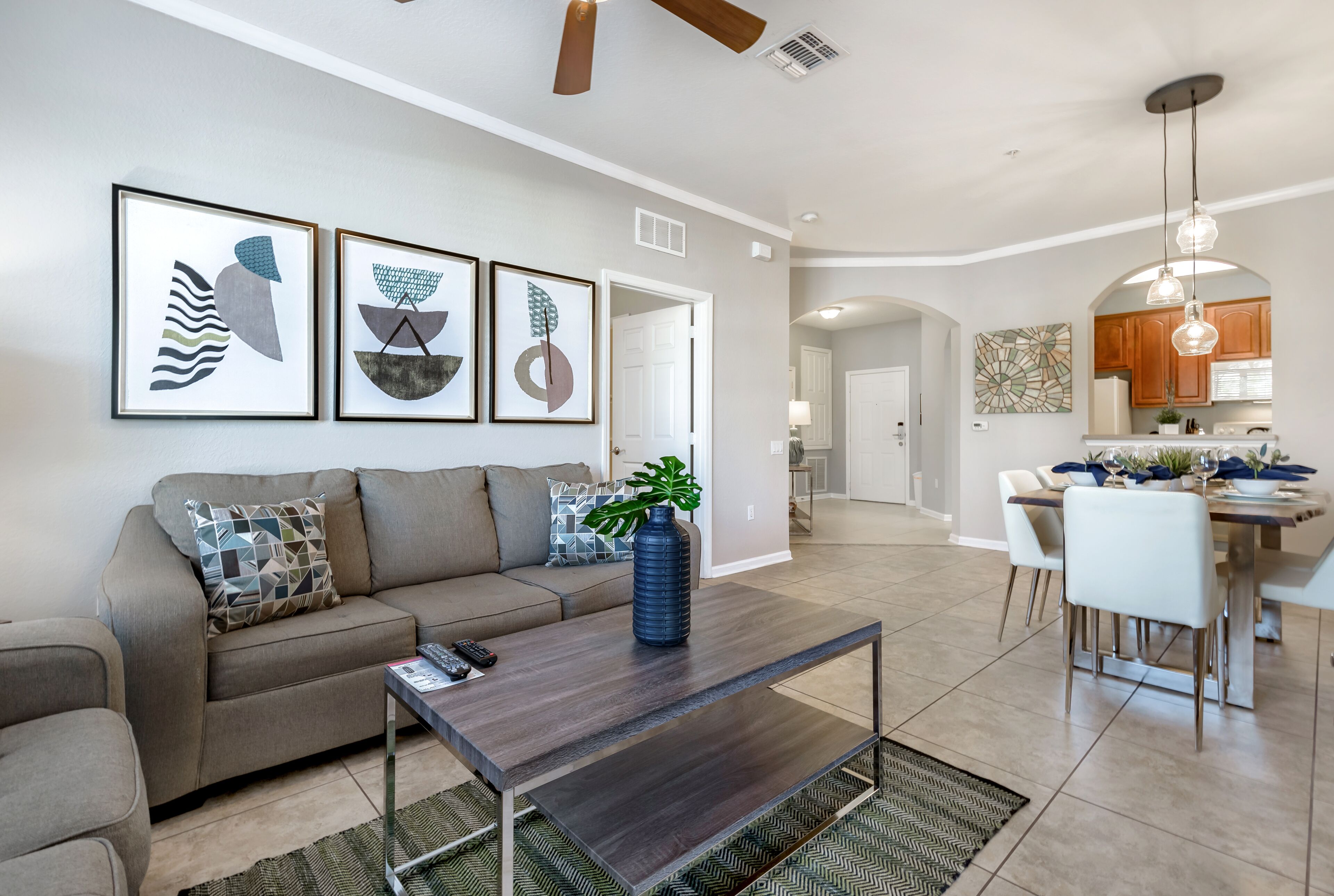 The fully equipped kitchen offers everything you need to cook up your families favorite home cooked meals! The open floor plan creates the perfect environment for the whole family to gather and enjoy these delicious home cooked meals and laughs together!In the master bedroom you'll find a king size bed and en-suite bathroom with a walk-in shower!Bedroom 2 offers a queen size bed and in bedroom 3, you'll find 2 full size beds. Just across the hall is a spacious shared bathroom with ample counter space as well as a shower and tub.Each bedroom has it's own flat screen TV! The quiet balcony is the perfect spot for your morning coffee or evening night cap to unwind after a long day out at the theme parks!This home is also equipped with a full size washer and dryer, so you can pack light! Free WiFi is also included!Vista Cay Resort is right next door to the Orange County Convention Center, and less than 15 minutes away from all major theme parks, including SeaWorld, Universal Studios and Walt Disney World.