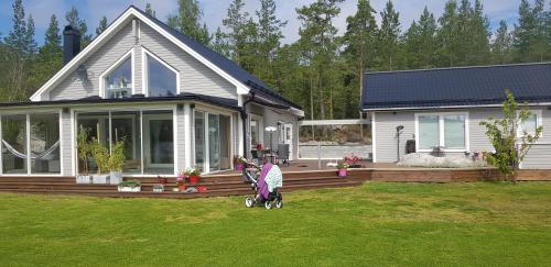 Warm welcome to our archepelagio villa with a lovely garden, pool, guesthouse and fantastic view. You can be a larger family or two smaller families and enjoy lazy days by the pool or sea, or active days in the wonderful nature at Resarö snd Vaxholm!