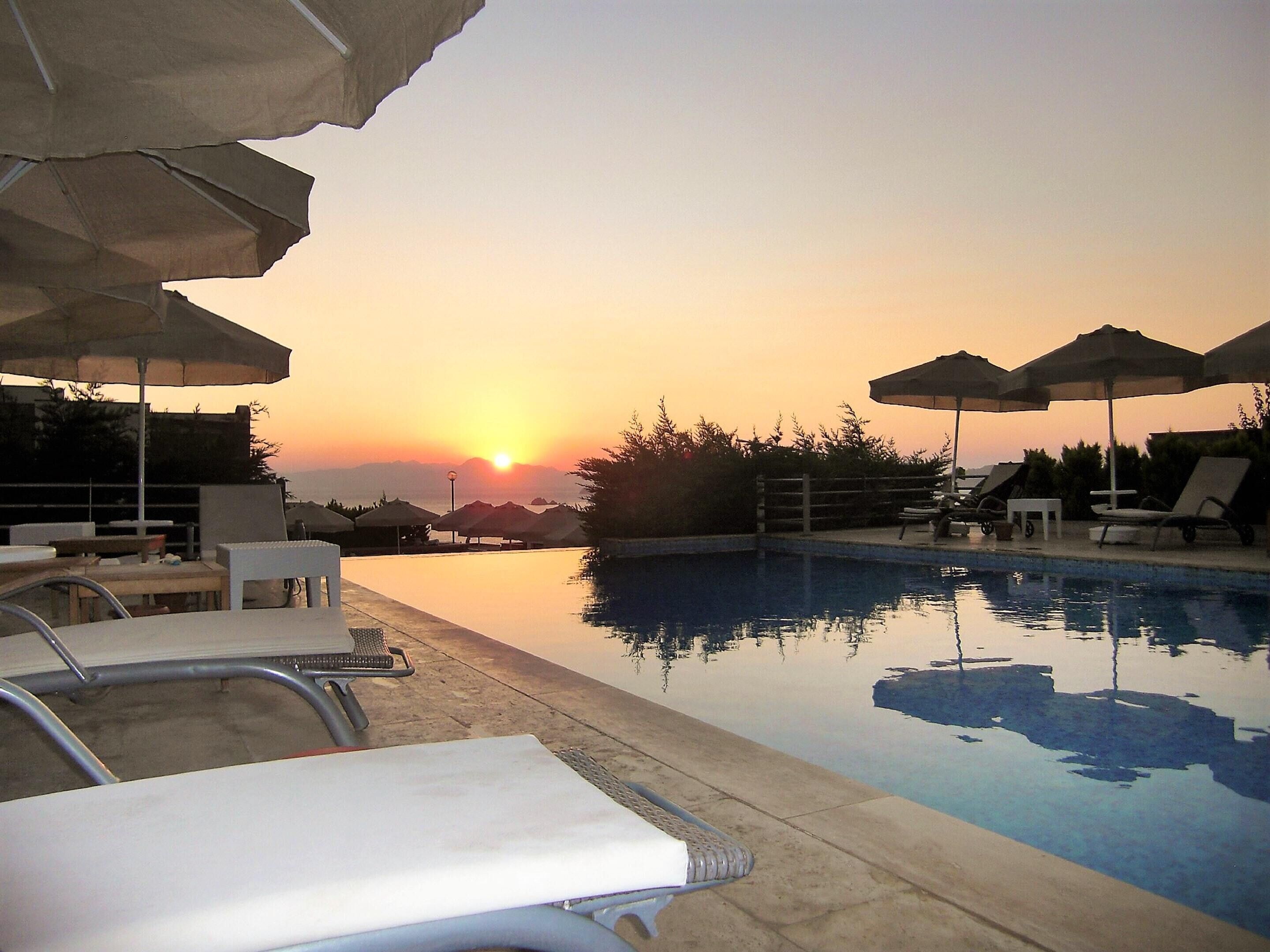 Private pool, parking space, close to sea, marina, shopping area, with a view of Turgutreis and islands of Greece.