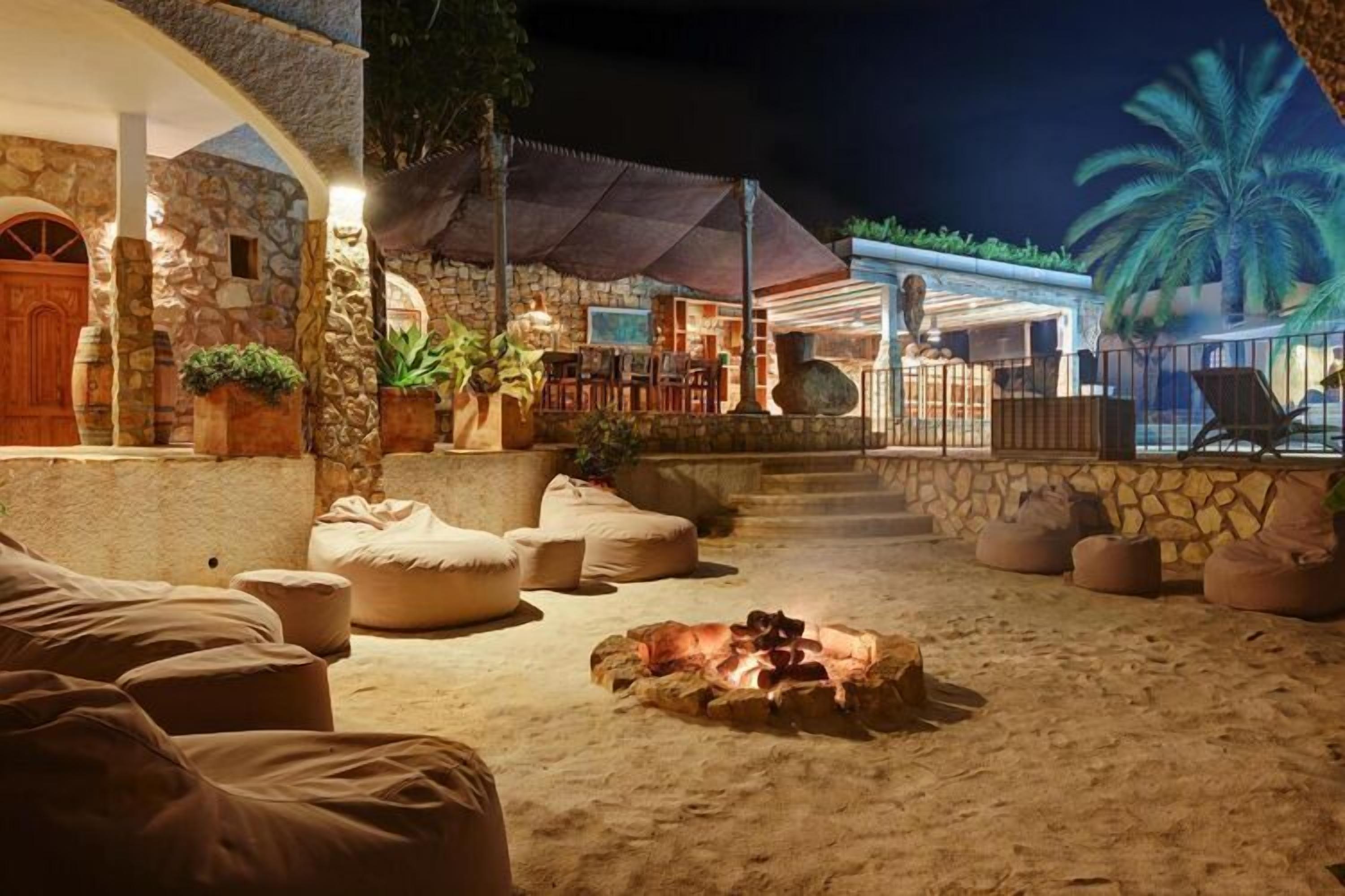 A cozy lounge area completes the indoor living space, featuring comfortable seating and a fireplace for cooler evenings, creating a perfect atmosphere for relaxation and socializing. The villa’s interior design reflects a harmonious blend of contemporary aesthetics and traditional Mediterranean influences, ensuring a warm and inviting ambiance throughout.