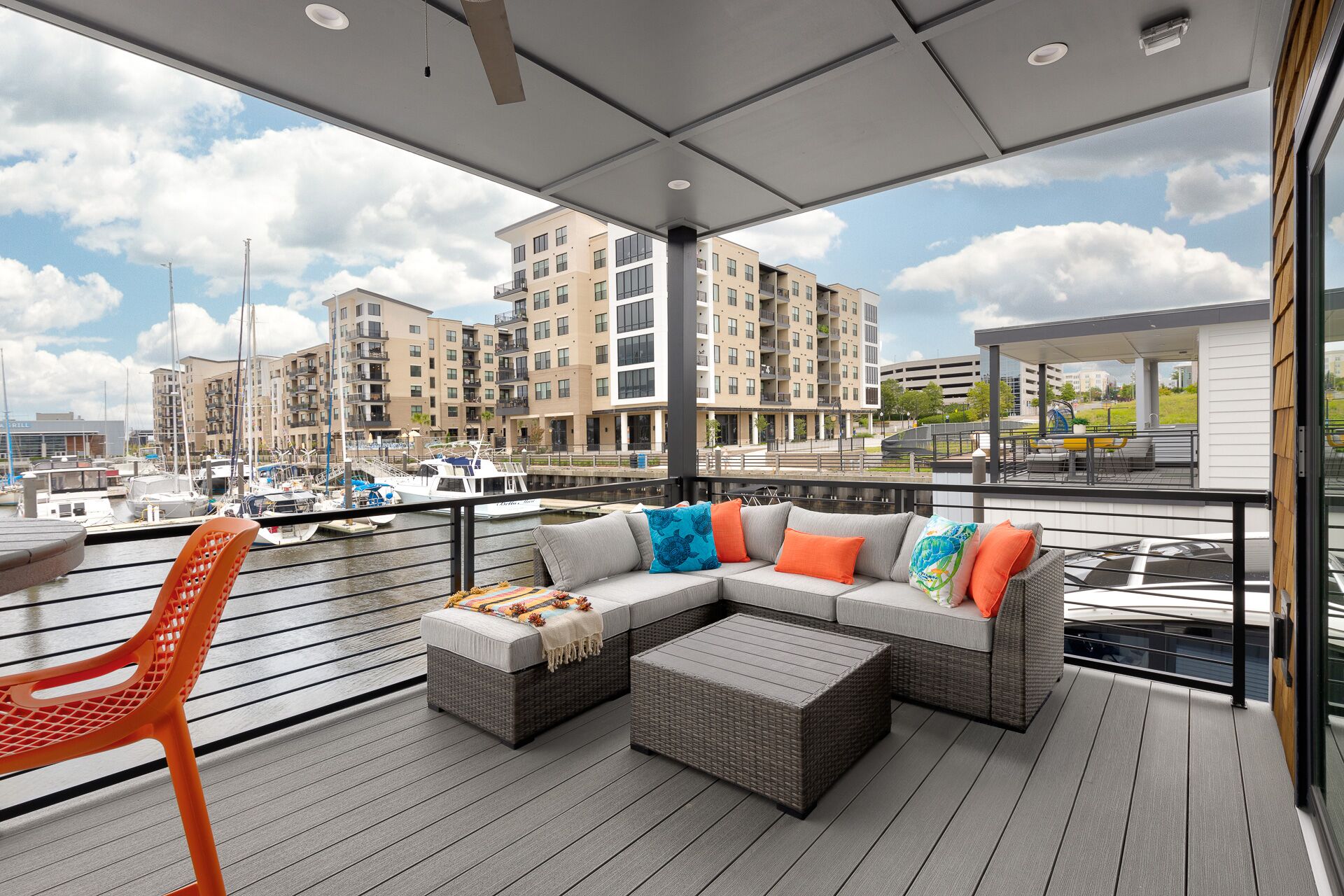 Outdoor entertainment space with full sized sectional couch and evening lighting