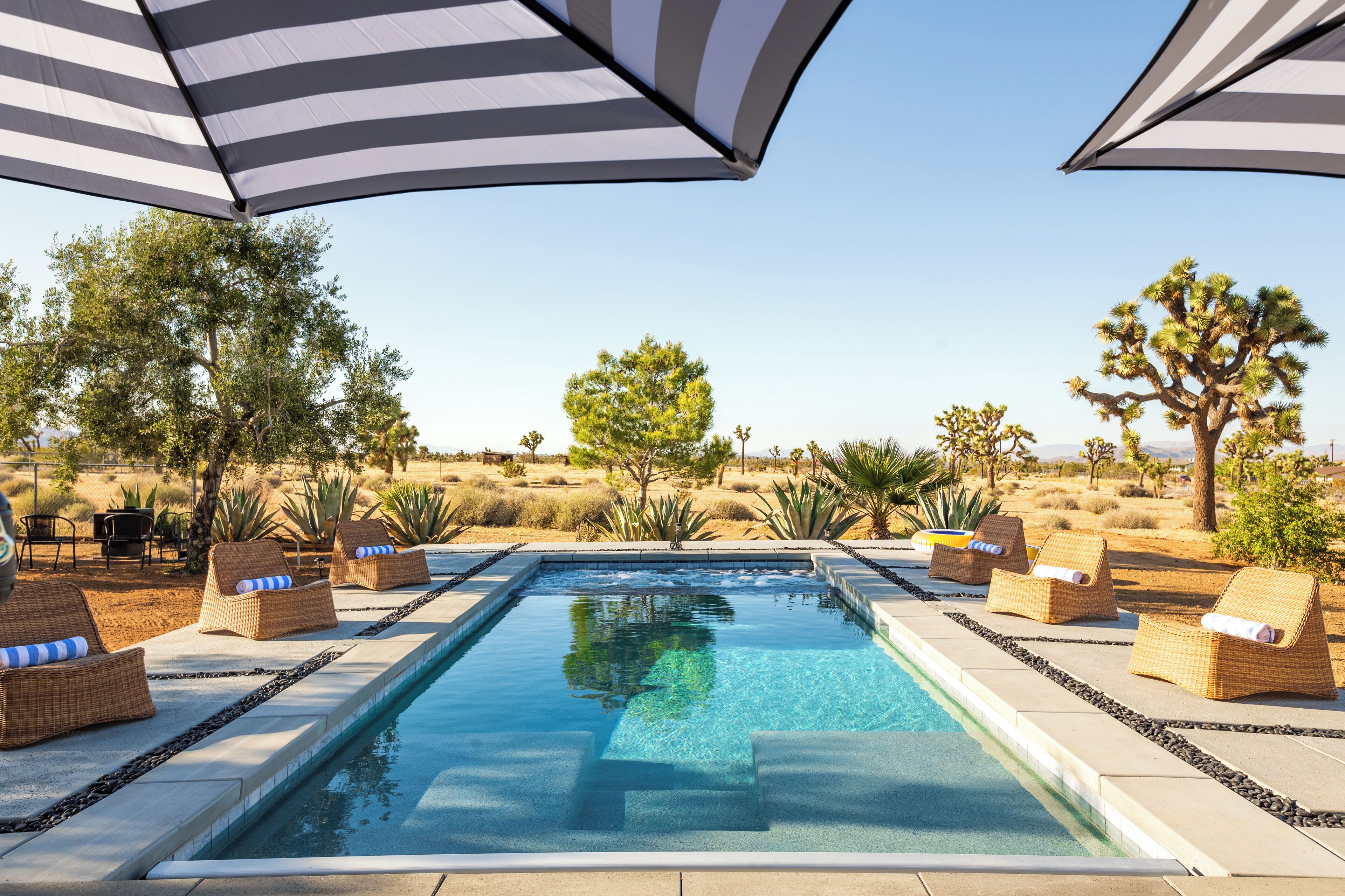 Stardust Luxe is a newly constructed home that gives you a serene retreat in the desert. Relax poolside, stargaze from the hot tub, gather around the fire pit, or sway in a hammock while gazing at Joshua Trees. The property is a private half-acre lot backed up to acres of open land.